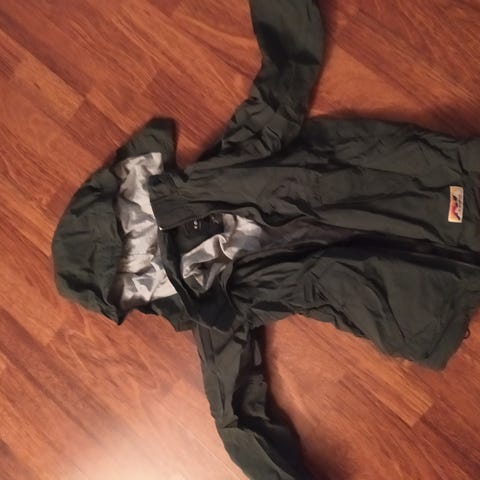 Lasten takki koko 122, väriltään vihreä, sininen ja ruskea pilkkukuosilla. Takissa on vetoketjullinen etuosa, huppu ja joustavat hihansuut sekä helma.