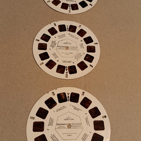 Nalle Puh ja hunajapuu View Master -kiekkojen teemana. Kaksi kiekkoa, kuvat ehjät mutta pinnassa paikoitellen kulumaa.