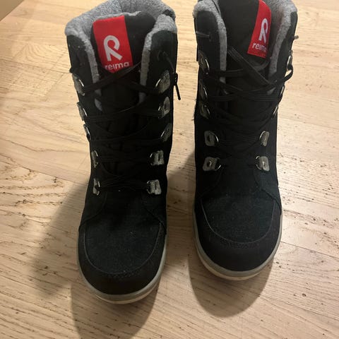 Reuman lämpimät talvikengät, helppo pukea sivussa olevan vetoketjun avulla. Nauhat lähinnä koristeena. Jonkin verran käytönjälkiä, mutta uutena meille tulleet ja yhden lapsen käyttämät. Juuri käsitelty suoja-aineella!