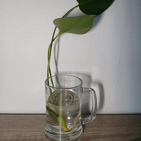 Myydään peikonlehden pistokas, jossa on kaksi lehteä. Pistokas on ollut reilun kuukauden juurtumassa vedessä ja juuret ovat jo hyvin kehittyneet.