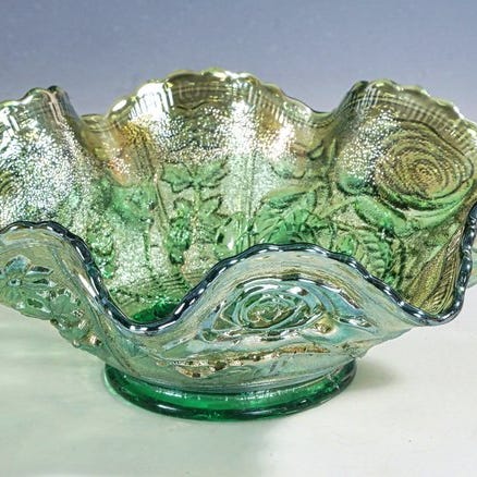 Tämä on Jeanette Glass Companyn valmistama Iris and Herringbone -kuvioinen marigold-värinen karnevaalilasiastia, jonka reunat ovat aaltoilevat. 2 samankokoista ja 1 pienemi/ korkeampi reunainen.