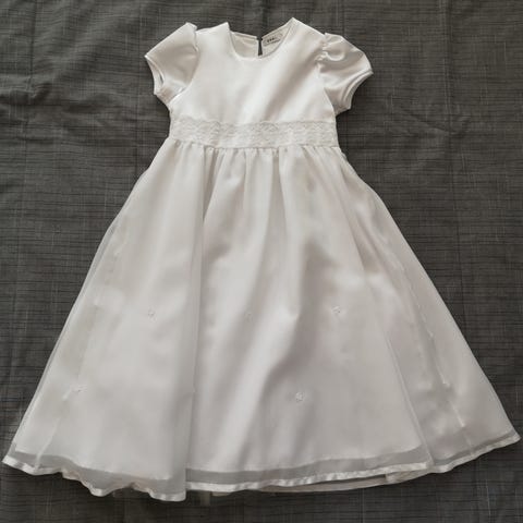 H&M Valkoinen mekko, koko 116 cm, suunniteltu tytöille. Mekossa on hihaton yläosa ja pitsinen alaosa, jossa on kukkakuviointi. Mukana on myös samaa materiaalia oleva rusetti, joka toimii asusteen lisänä.
