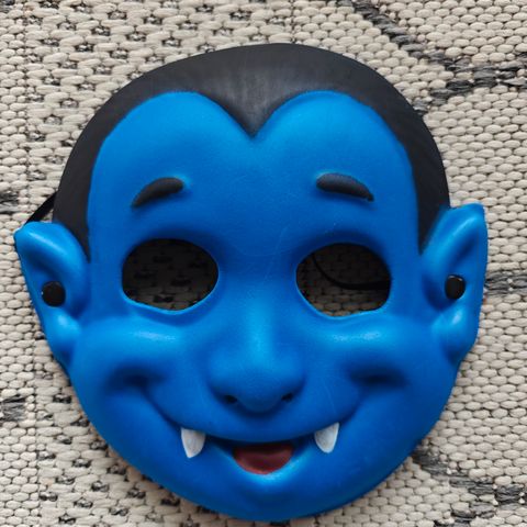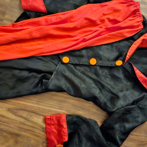 Käännettävä roolivaatesetti. Mustat housut. Paita toiselta puolelta kreivi Draculan kaltainen kauluksineen. Paidan nurjalla puolella punaiset lepakot mustalla taustalla.