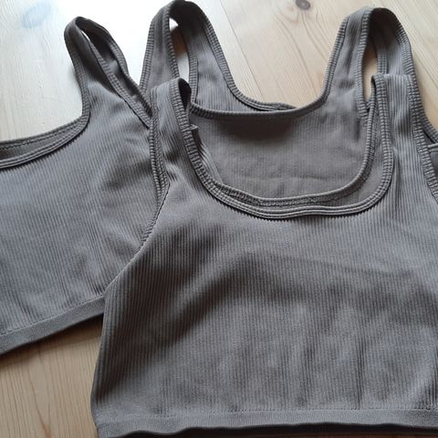 Neliömäinen khaki-värinen crop-toppi dramaattisilla puhvihihoilla.