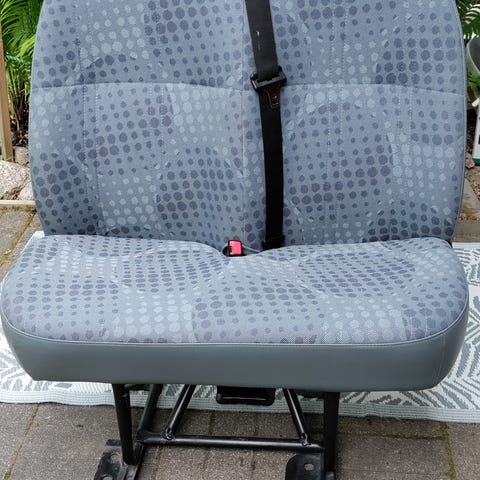 Transitin istuin sinisellä, kuvioidulla kankaalla. Istuimen leveys noin 70 cm ja istuinkorkeus noin 48 cm, selkänojan korkeus noin 54 cm. Istuimessa on pääntuki ja turvavyön kiinnikkeet. Istuin on yksittäinen matkustajan istuin, sopii erilaisiin ajoneuvoihin. Materiaali kangas, väri sininen monivärisillä kuvioilla.