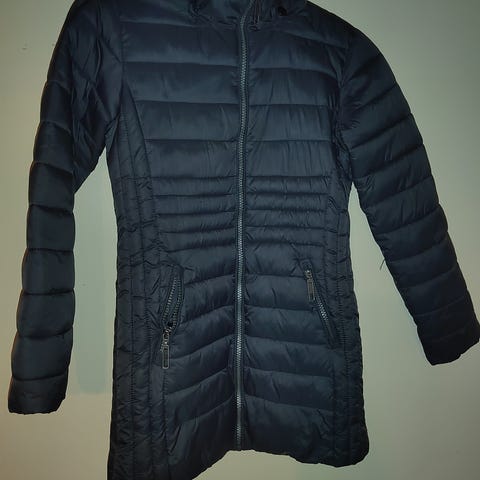 Peuhu lasten talvitakki. Koko 130. Sininen/vihreä. Muuten ei vikoja, mutta hihojen alapuolien saumoissa kulumaa (kuva).