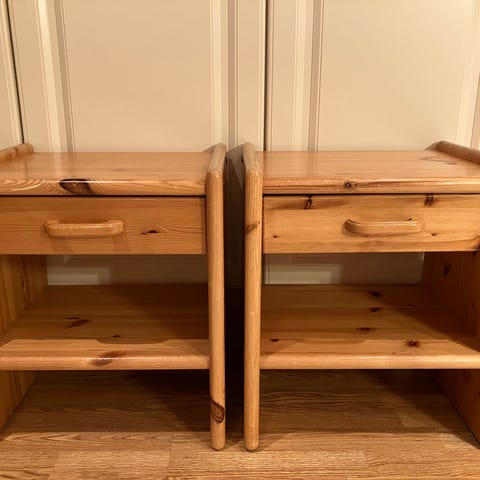 Myynnissä kaksi kaunista ja tukevaa täyspuuta olevaa yöpöytää, joissa yhdistyy lämmin puu ja musta metallikoriste.
