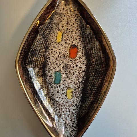 Myydään keraaminen lautanen, muotoiltu koiranpäänä, ruskea ja valkoinen väri. Lautanen soveltuu koristekäyttöön tai pienille tarjoiluille. Korkeus 18,5 cm. Nouto tai postitus 6 eur.
