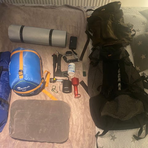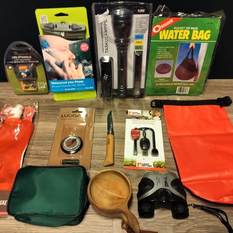 Erilainen setti kaikenlaista tavaraa retkeilyyn tai muuhun vaellus toimintaan. Kaikki on käyttämätöntä.