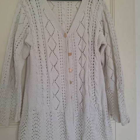 Myydään käyttämättömänä säilytetty klassinen kaunis käsityönä kuvioneulottu luonnonvalkoinen neuletakki villaneule, neulelanka miellyttävä lämmin laadukas villalanka,