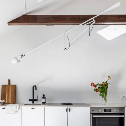 Flos 265 seinävalaisin. Muuten siistikuntoinen, mutta painossa on muutamia kolhuja (ei näy käytössä ja tämä huomioitu hinnassa). Painon kiinnitysruuvi hukkunut, mutta uuden saa varmasti rautakaupasta.