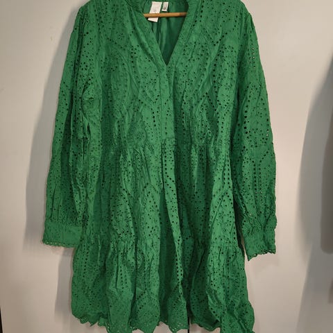 YAS Mekko, koko L. Mekko on valmistettu puuvillasta ja siinä on beigen vihreä väri. Mekossa on koristeellinen kirjailu ja pitkä hiha. Kainalo-kainoalo 53 cm, olka-helma 93 cm.