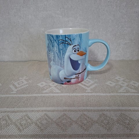 Kuvassa näkyvä Disney Frozen -muki Olaf-lumiukko. Postitus tai ToriDilli.