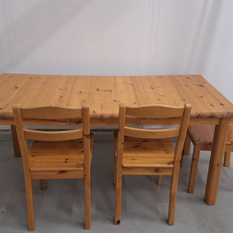 Erittäin tukeva mäntypöytä pituus 160 X 80 ja 6 kpl tuoleja, hyvät istua ei nitku eikä notku. Kansi n.38mm, pientä ajan patinaa. Vain nouto..