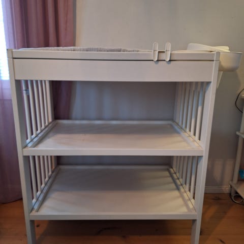 Itsetehty hoito pöytä pyykkikoneen päälle. Pöydässä alusta kiinni ja sivussa pieniä lokeroita tavaroiden säilytystä varten. Mukana tulee 2kpl ikean alustan suojia.