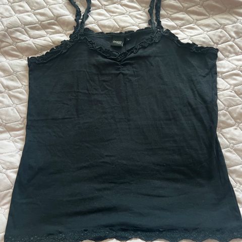 PBO Hihaton Toppi, koko L, musta väri. Valmistettu 100 % viskoosia, joustava. Kauluksessa ja olassa verkkomainen reunus. Kainalo-kainoalo 46 cm, olka-helma 68 cm.