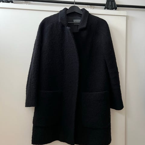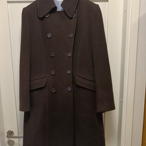 SAND Copenhagen kaunis tummanruskea villakangastakki kokoa 36 (reilu koko, vastaa ennemmin kokoa 38). Takki on pitkä malli ja valmistettu monivärisestä neuloksesta, jossa näkyy ruskean eri sävyjä.