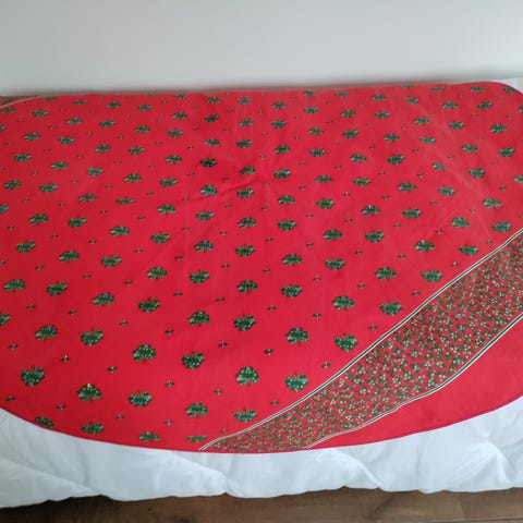 Joulun punainen pöytäliina Halkaisija ilman hapsuja n. 134 cm.