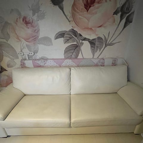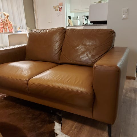 Myydään Landskrona nahkasohva, valkoinen. Sohvan suojana olleet viltit. Käsinojassa hieman venymää.