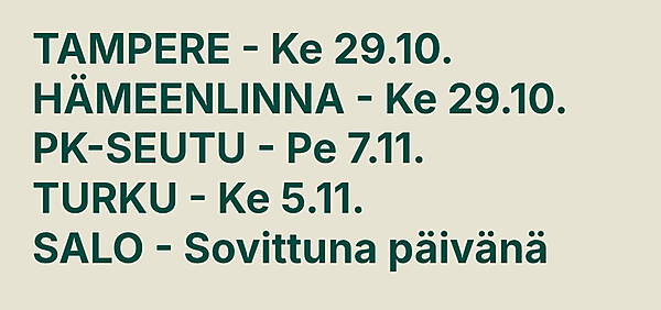 Hyödynnä ilmainen toimitus Turkuun, Helsinkiin, Tampereelle tai Hämeenlinnaan. Toimituspäivät julkaistu etusivulla.