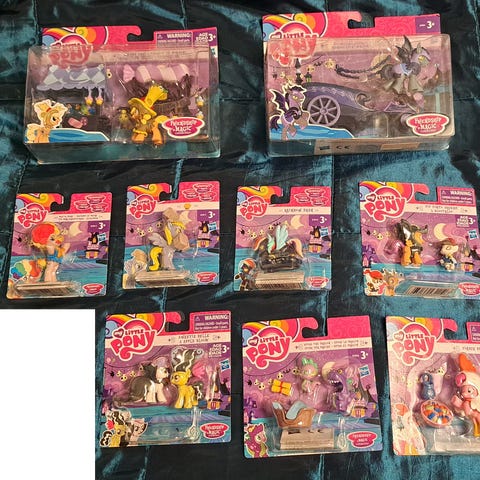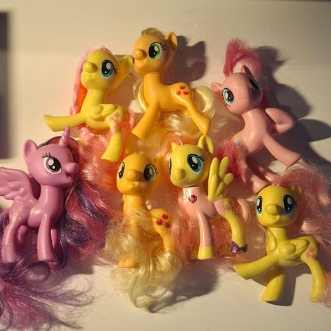 Myyntiin hyllyssä ja säilytyksessä olleita leikkimättömiä G4 My Little Pony -poneja.