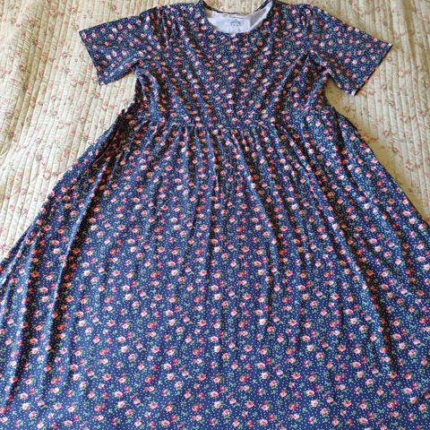 Mekko on 98% puuvilla, 2% elastaania. Joustaa. Sivuilla molemmin puolin hyvänkokoiset taskut. Takana joustovyötörö, joka tekee mekosta hyvin istuvan. Midipituinen. Lyhyet hihat.
