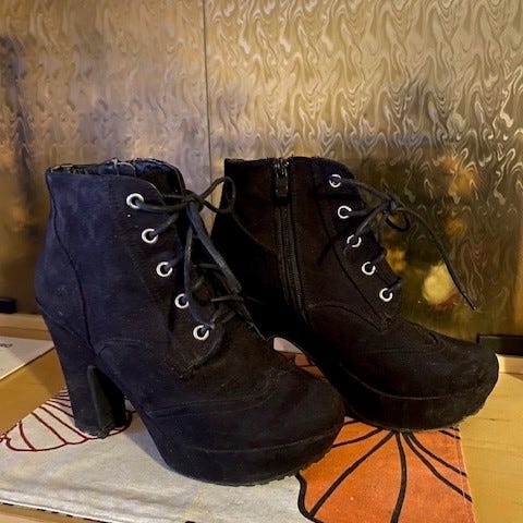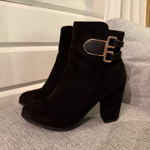 Mustat korolliset nilkkurit, sisäpinta nahkaa. Korko noin 10 cm. Ei havaittavia vikoja. Mukavat kävellä.