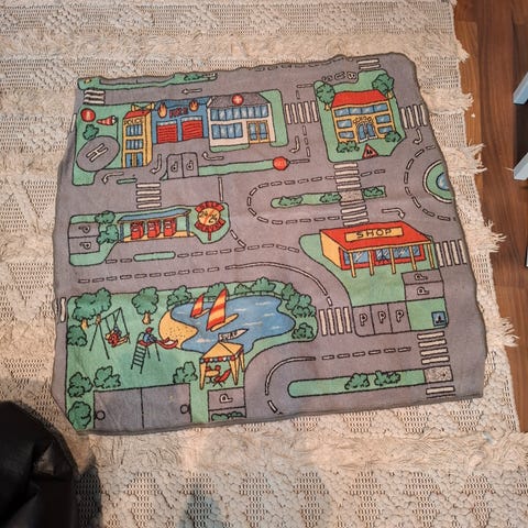 Hyväkuntoinen automatto, pesun jäljiltä rypyssä ja kuvassa kellertävä valo, pohjaväri on harmaa. Koko 130cm×90cm. Haku Laajavuoresta tai toridiili.