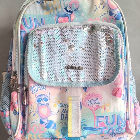 Käyttämättä jäänyt kaunis laukku tukevaa kangasta. Ranskasta lastenliikkeestä ostettu. Korkeus 31,5cm ja leveys 35,5, pohjan syvyys 8cm. Haku Laajavuoresta tai toridiili.