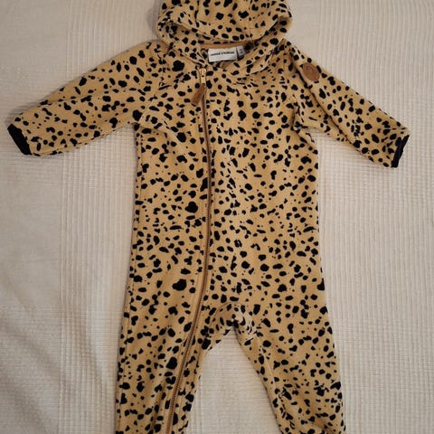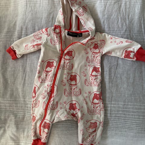Ahkerassa käytössä ollut haalari. Reilu koko, jossa lapsen on mukava harjoitella liikkumista. Värit jo haalenneet ja pientä kulumaa siellä täällä. Kuitenkin täysin ehjä. Pientä nukkaa.