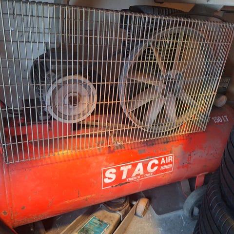 Italialainen 2pyttyinen kompressori valovirralla ja 50l säiliöllä. Ilmansuodattimet on mennyt rikki, ne olisi hyvä uusia ennen käyttöä.