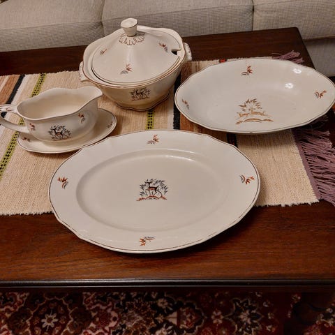 Vanha posliini kahviastiasto 5:lle henkilölle. Lisäksi yksi ylimääräinen asetti. Kaikki ovat erittäin hyvässä kunnossa ja kultaukset täysin kunnossa. Astiasto on valmistettu Kiinassa. Merkkiä en tiedä, kun on Kiinaksi kupin pohjassa.