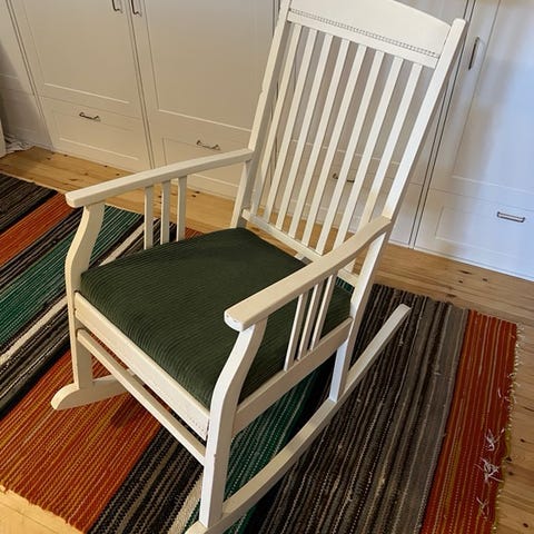 Myyntiin vanha keinutuoli. Aikoinaan uudelleen maalattu ja korjattu.