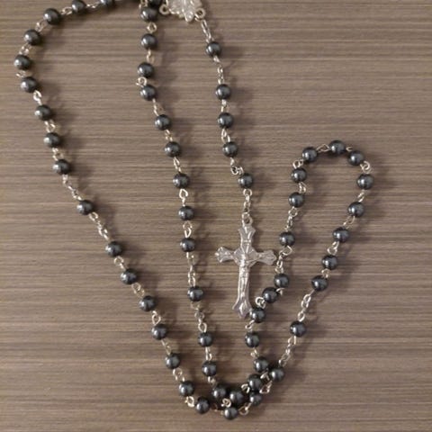 Turkoosi/valkoinen rukousnauha. Päässä hopeanvärinen pallo, jonka sisällä kristalli. N. 40cm.