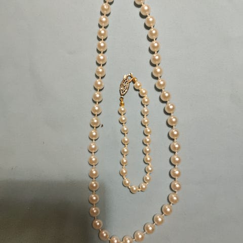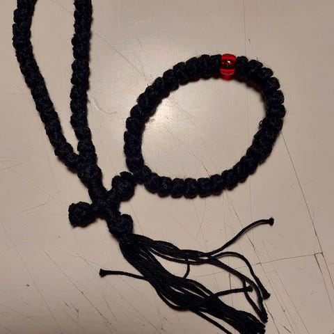 Vihreä/oranssi/punainen rukousnauha. Päässä metallinen fatiman käsi.