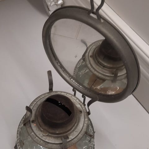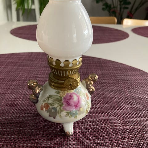 Pieni lasinen öljylamppu. 15 cm korkeus. Lähinnä koristeeksi. Lanka ei ole kovin pitkä.
