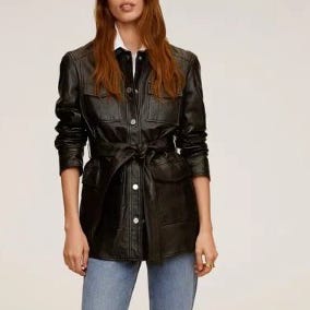 Myynnissä Mango-merkkinen nahkatakki.