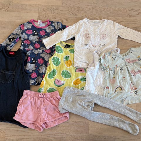 Pieni vaatepaketti tytölle, koko 86. Paketti sisältää 4xmekko/tunika ja 1xpotkupuku/jumpsuit.