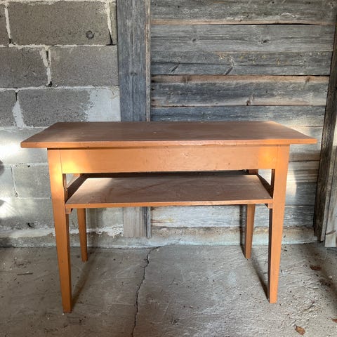 Antiikkinen pöytä, valmistettu puusta. Pöydässä on kaksi vetolaatikkoa ja keskellä maisemakuviointi. Pöytä on ruskean sävyinen ja sen jalat ovat suorat. Pöydän pinnassa näkyy iän tuomia jälkiä.