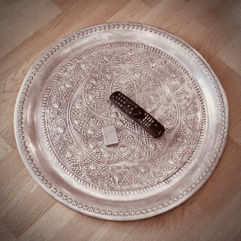 Kuparinen pyöreä tarjotin, halkaisija noin 62 cm. Tarjottimessa on kuvioitu pinta ja korotettu reuna. Soveltuu tarjoiluun ja koristekäyttöön.