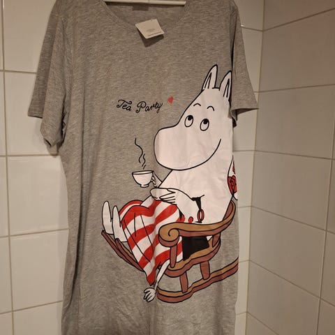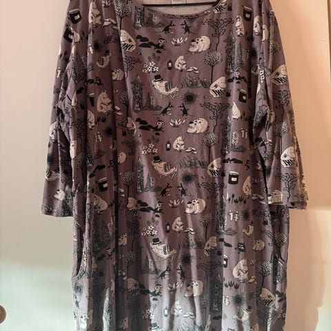 Muumiyöpaita Martinexilta, pitkähihainen, väriltään harmaa, jopa liilaan taittava, ehjä, Reilu mitoitus.