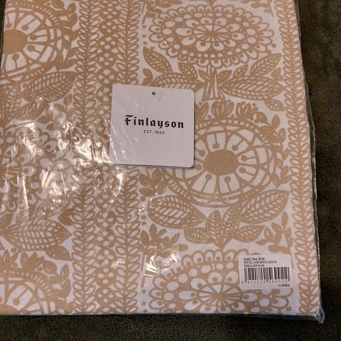 Myydään tehdasommeltu 60-, 70-lukulainen graafinen ruskea-tummanruskea pöytäliina Finlayson Finland, alkuperäisessä pakkaleveydessään 90 cm ja päärmätty pituuteen 86 cm, kangas ohut napakka 100% puuvilla ja todellakin pesuohje 60° ja tekstiililappu saumassa,