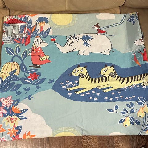Muumi viidakko lasten pussilakana, koko 120 cm x 160 cm. Kunto hyvä ja värit kirkkaat. Ei tyynyliinaa, vaan pelkkä pussilakana. Hinta 12e.