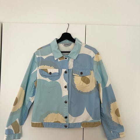 Myydään erittäin siisti Marimekon farkkutakki klassisella unikkokuviolla. Malli Sarpio unikko. Unikot asettuu takkiin kivasti. Väri harvinaisempi erittäin tumman sininen unikko. Väri ei toistu kuviin hyvin. Koko 38. Menee mielestäni myös 40 kokoiselle. Kainalomitta n. 53cm ja olka-helmamitta n. 52cm.