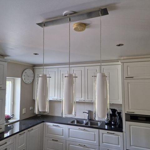 Kaksi roikkuvaa (kolmen ja neljän lampun) sekä kaksi spottia (kahden ja kolmen lampun). Polttimot mukana. Roikkuvien korkeus säädettävissä.