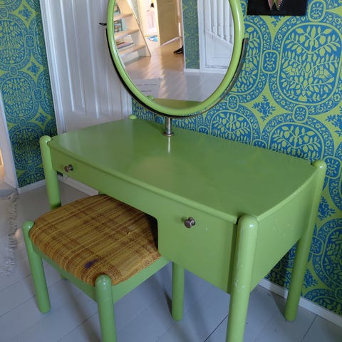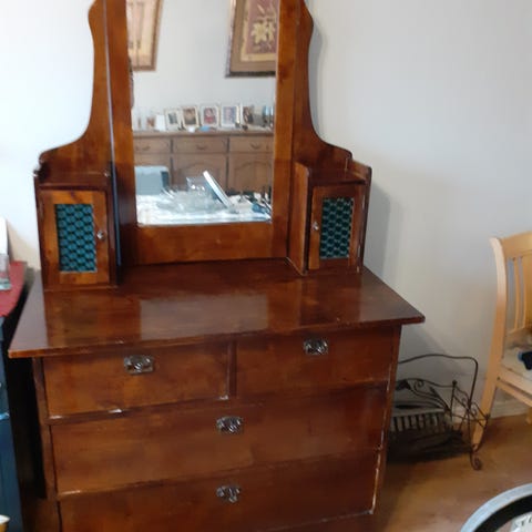 Tummaksi petsattu vanha peilipiironki. Peili vähän krakeloitunut ,vanha kun on.