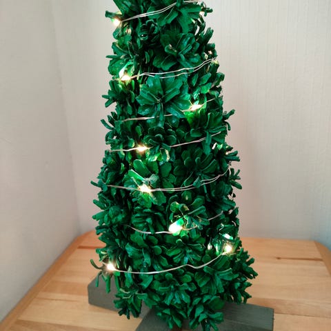 Pöytäkuusi LED valoilla. Kaunis koristepöytäkuusi, jossa 45 havun oksaa ja 15 led-valoa. Sisältää tukevan kuusenjalan juuttisäkissä, halkaisija 28 cm. Kuusen korkeus 45 cm. Yhteishinta 10 euroa (2 kpl).