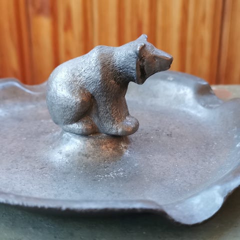 Tuhkakuppi tai koruastiaksikin sopiva metallinen astia. Karhu istuu keskellä. Koko 10,5 x 10,5 cm ja korkeus n. 4cm. Pohjassa kaiverrus E.M 1944. Hinta 25 eur + mahdolliset postituskulut ( ei toridiiliä).