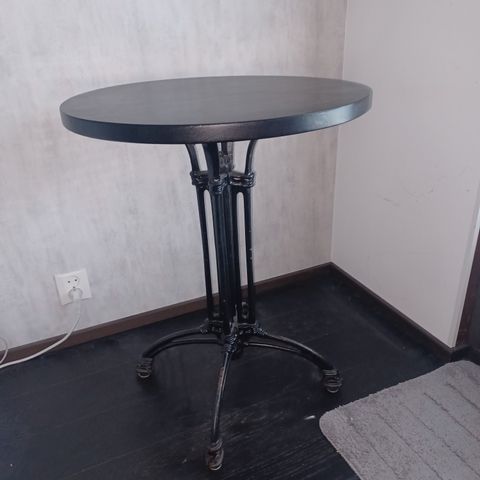Pöytälevy täyspuuta, runko mustaa rautaa eli pöytä on todella painava eikä sitä saa kasaan. Aputasojen levyt ovat pleksiä ja ovat ainoat irrotettavissa olevat osat.