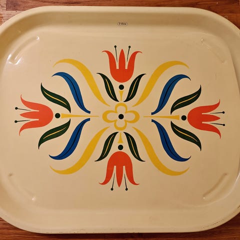 Kiva vanha metallitarjotin, halkaisija 34 cm. Hyvä kunto, vähän patinaa paikoin. Nouto tai postitus.